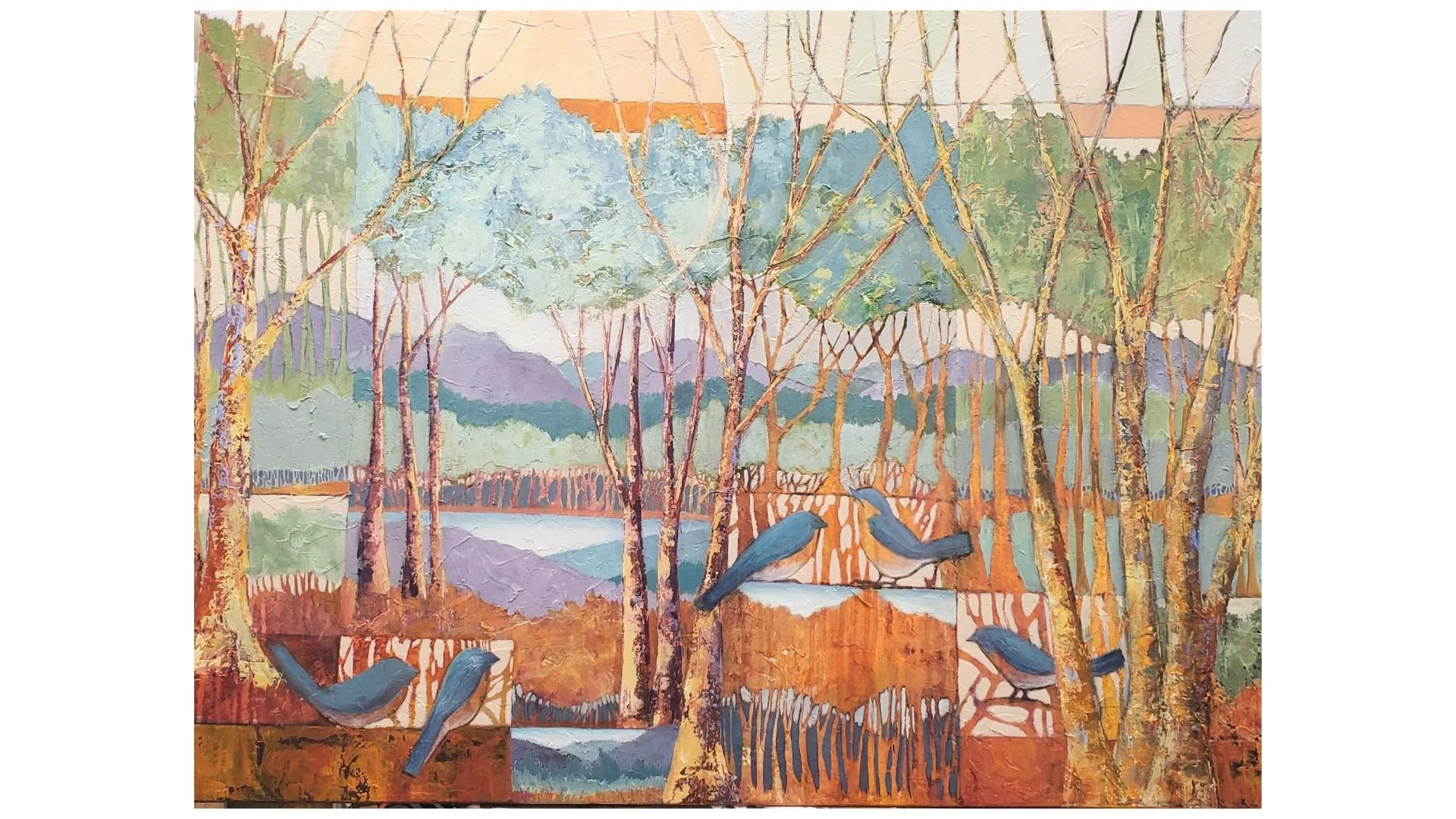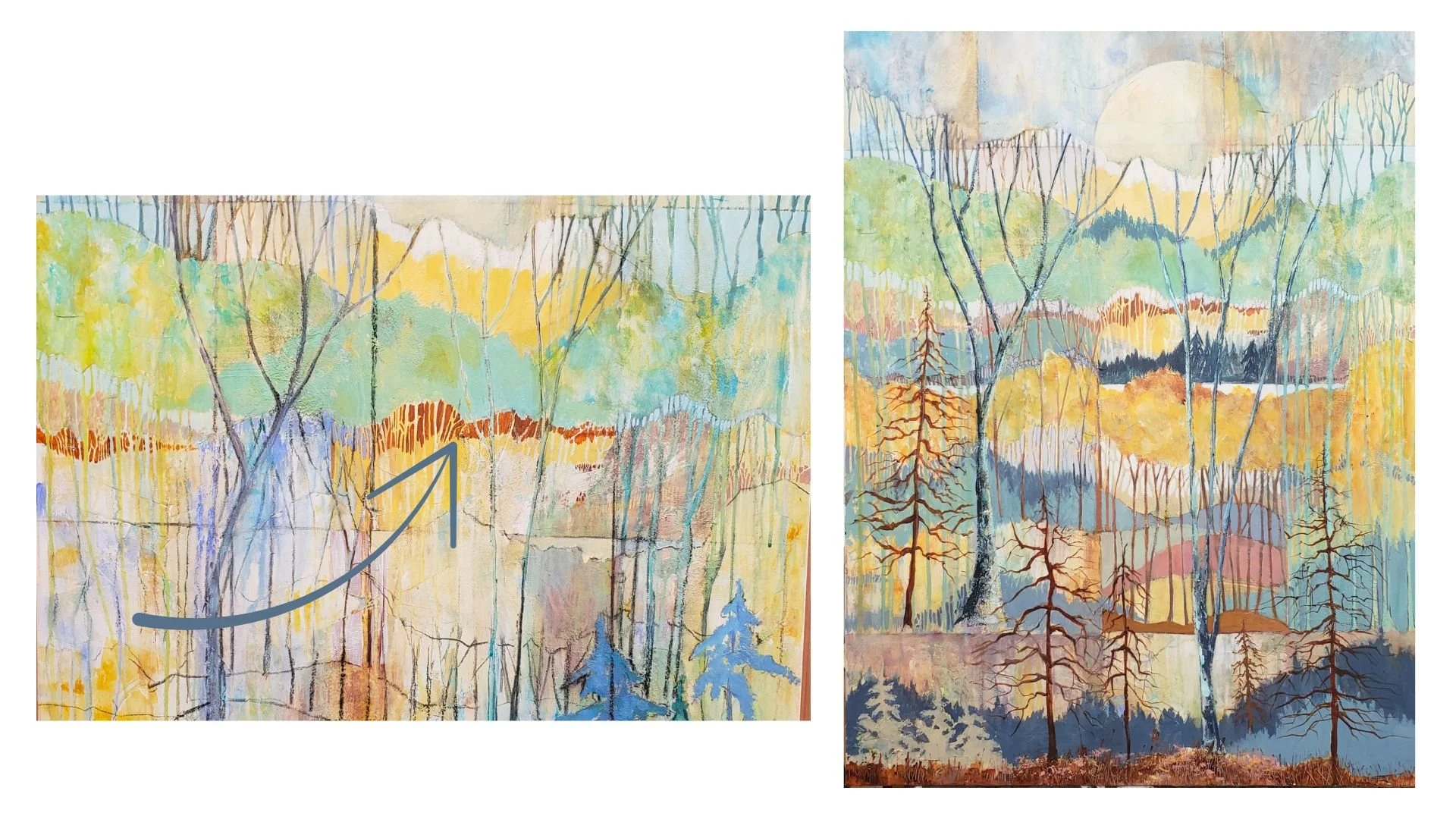 I sit with the painting and listen to what it wants to express. As it starts communicating, I respond by developing certain sections using negative painting. For example, I may paint around silhouettes of a row of tree trunks rather than the trunks themselves, allowing the background to define their shapes. This is my favorite part of the process. It is very meditative, and time stops.