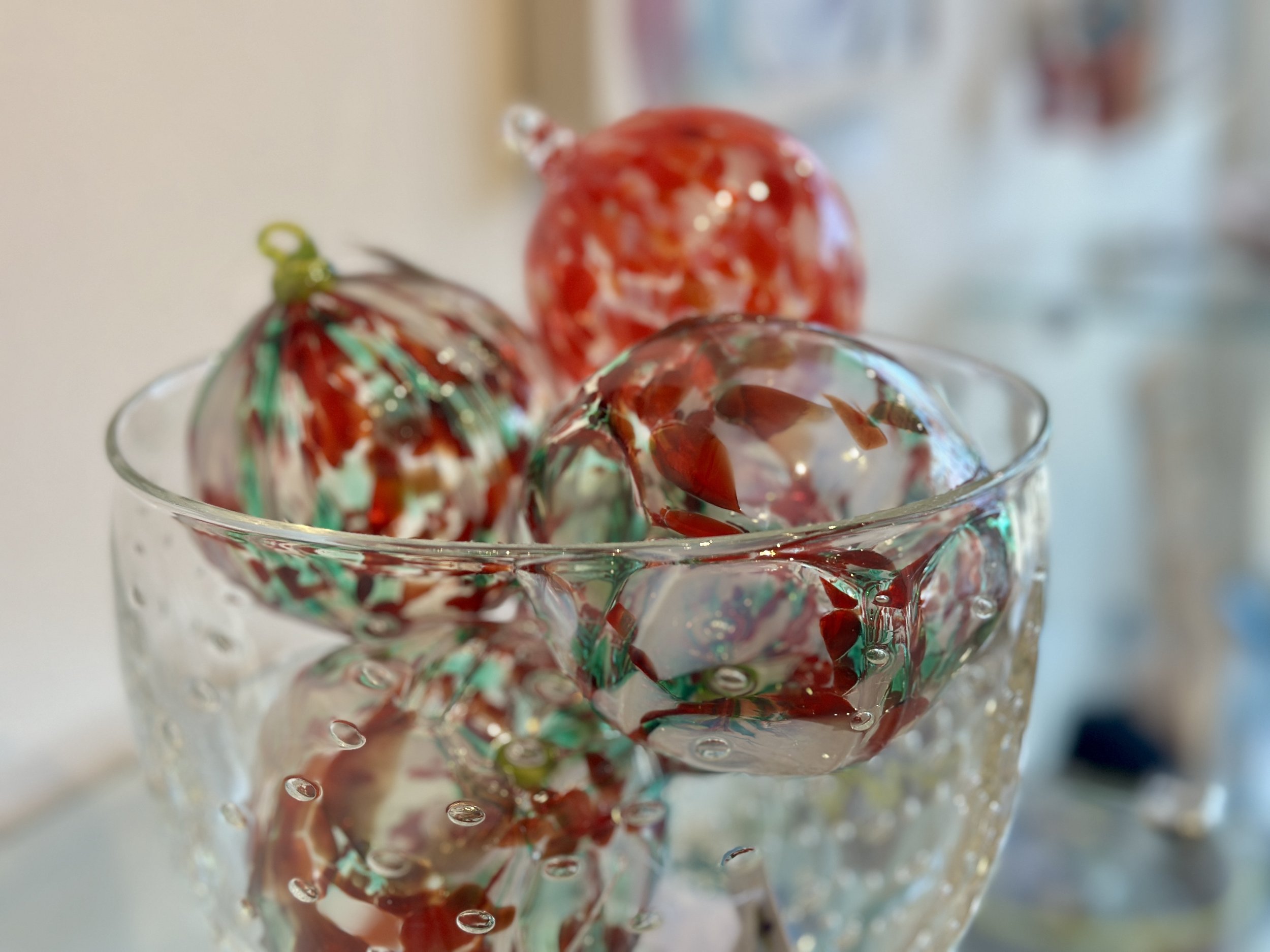 As always, glassblower Pringle Teetor has made beautiful blown-glass balls in many colors, patterns and textures. Her new design this year is a Sugar Plum!