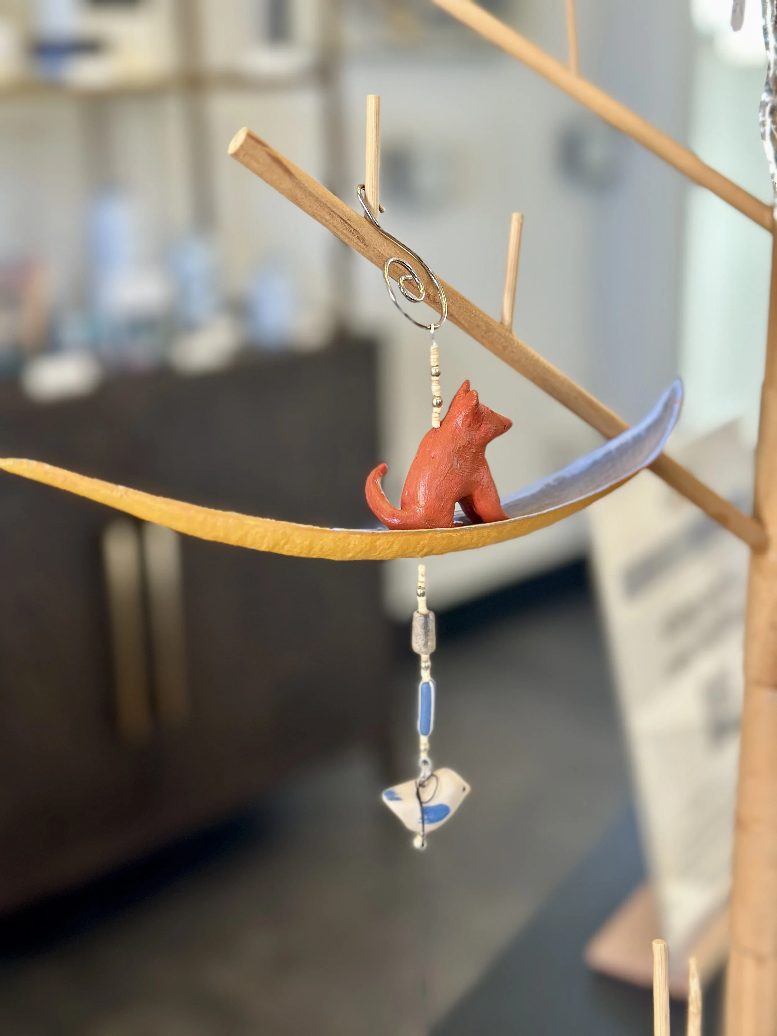 Potter Evelyn Ward has created hand-built, raku-fired bird ornaments in many sizes and colors. She also has adorable ceramic ladybugs.