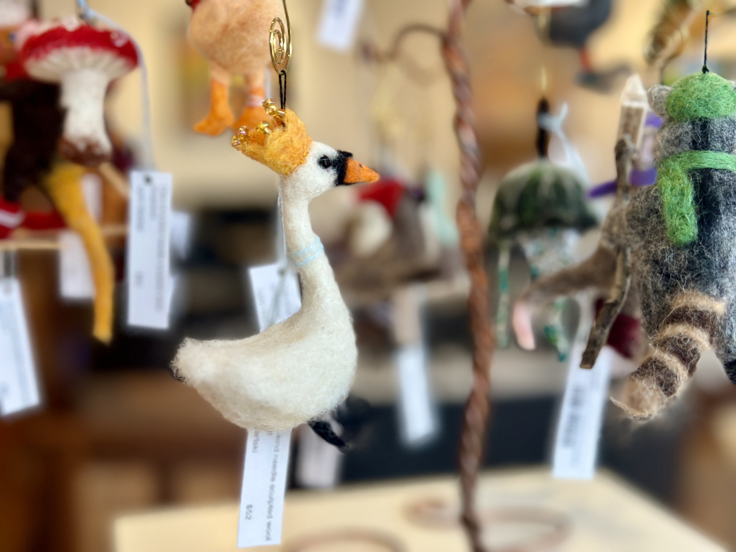 Artist Lynn Wartski has created one-of-a-kind felted wool ornaments made with quilt batting and colored wool which she needle-felts to achieve the desired shape and fullness.